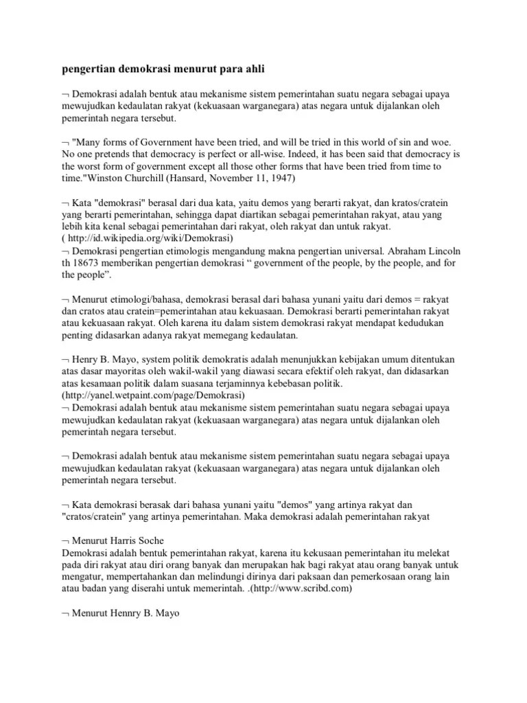 Pengertian Demokrasi from imgv2-1-f.scribdassets.com Demokrasi ialah suatu sistem pemerintahan negara yang dimana seluruh kekuasaan pemerintahan berada di tangan. Adanya beberapa kelebihan tersebut banyak juga negara yang menerapkan sistem demokrasi. Sebenarnya, apa yang dimaksud dengan demokrasi? Pengertian demokrasi liberal secara umum adalah , pasti banyak orang yang telah mendengar kata kata demokrasi, hampir tiap hari kita mende. Secara mudah kita bisa pahami bahwa demokrasi merupakan pemerintahan rakyat. Pengertian demokrasi adalah bentuk pemerintahan yang mana tiap warga negaranya mempunyai hak yang sejajar dalam pengambilan keputusan yang bisa mengubah hidup mereka. Pengertian demokrasi adalah suatu sistem pemerintahan dimana semua warga negaranya mempunyai hak dan kesempatan yang sama/ setara untuk berkontribusi dalam proses pengambilan. Selain pengertian demokrasi yang sudah disinggung secara umum di atas, para ahli juga memberikan pengertian dari demokrasi seperti pengertian demokrasi menurut hans kelsen yaitu suatu pemerintahan yang diadakan serta dilaksanakan oleh rakyat dan untuk rakyat itu sendiri.